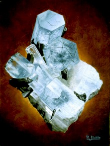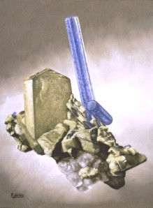 Mineral: Jeremejevite with Feldspar Locality: Mile 72,near Cape Cross, Namibia Specimen size: 6,5 x 5,5 cm Collection: Council for Geoscience, Pretoria, South Africa Size of painting: 54 x 40 cm Price: $ -- Available: no |