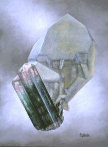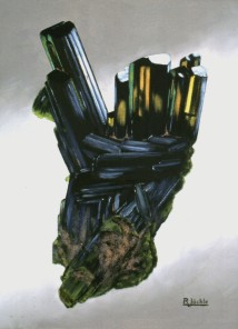 Mineral: Tourmaline and Quartz Locality: Karibib, Namibia Specimen size: 4 x 2,5 cm Size of painting: 54 x 40 cm Price: $ -- Available: sold |