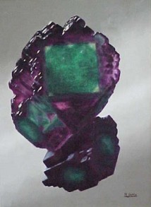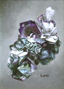 Mineral: Fluorite Locality: Okoruso, Namibia Specimen size: 4 x 3,2 cm Size of painting: 54 x 40 cm Price: $ 1700,- Available: yes |