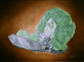 Mineral: Prehnite and Quartz Locality: Gobobose Mountains, Namibia Specimen size: 2 x 2,5 cm Size of painting: 40 x 54 cm Price: $ 1700,- Available: yes |