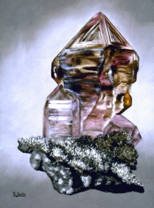 Mineral: Quartz Sceptre Locality: Gobobose Mountains, Namibia Specimen size: 10 x 6 cm Size of painting: 54 x 40 cm Price: $ 1700,- Available: yes |