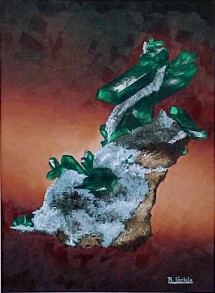 Mineral: Dioptase on Plancheite Locality: Kaokoveld, Namibia Specimen size: 3 x 3 cm Size of painting: 54 x 40 cm Price: $ 1700,- Available: yes |