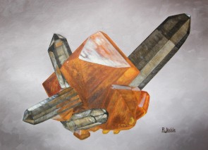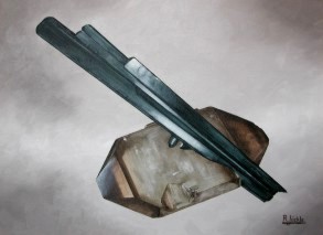 Mineral: Zircon with Smoky quartz Locality: Zomba, Malawi Specimen size: 1,8 cm Collection: Karl Messner Size of painting: 40 x 54 cm Price: $ 1700,- Available: yes |