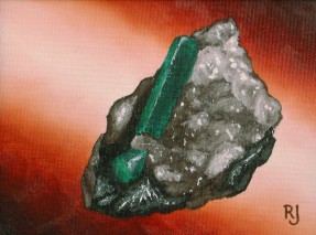 Mineral: Emerald Locality: Gravelotte, South Africa Specimen size: 7,5 cm Size of painting: 16 x 21 cm Price: $ 254,- Available: yes |